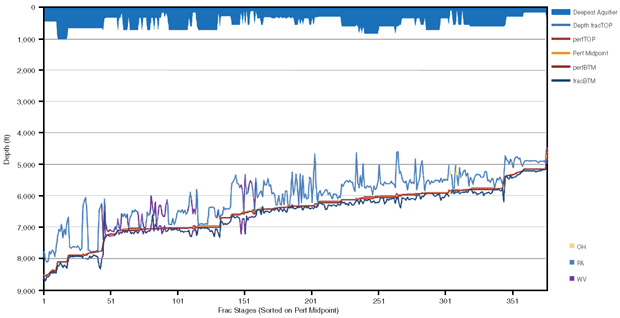 The Marcellus data show a similarly large distance between the top of the tallest frac and the location of the deepest drinking water aquifers as reported in USGS data (dark blue shaded bars at the top of Figure 2). Because it is a newer play with fewer mapped frac stages at this point and encompasses several states, the data set is not as comprehensive as that from the Barnett. However, it is no less compelling in providing evidence of a very good physical separation between hydraulic fracture tops and water aquifers.