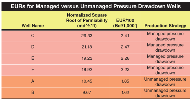 Pressure drawdown was not managed in two of the wells (A and B), while the other six (C, D, E, F, G and H) used some form of pressure management. Wells G and H were added later, since they had higher production histories and actually reached the line pressure. The other four managed pressure wells were still producing at pressures higher than line pressure at the time the study was conducted. Various diagnostic plots were performed to determine each well’s flow capacity (normalized by lateral length). As shown in Table 1, the wells with managed pressure drawdown (15-25 psi/d tubing and casing pressure drop) have significantly higher flow capacity and EURs compared with the wells with unmanaged pressure drawdown.
