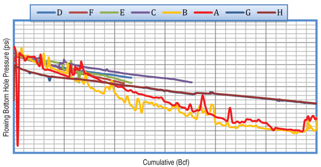 It is worth mentioning that wells G and H produced from tubing while the others were initially produced through casing, and then through tubing when the critical rate was reached. The desired production rate was achieved as long as tubing pressure was above line pressure. In this case, no critical pressure was seen and managed pressure drawdown eliminated the risk of reduced hydraulic fracture conductivity.