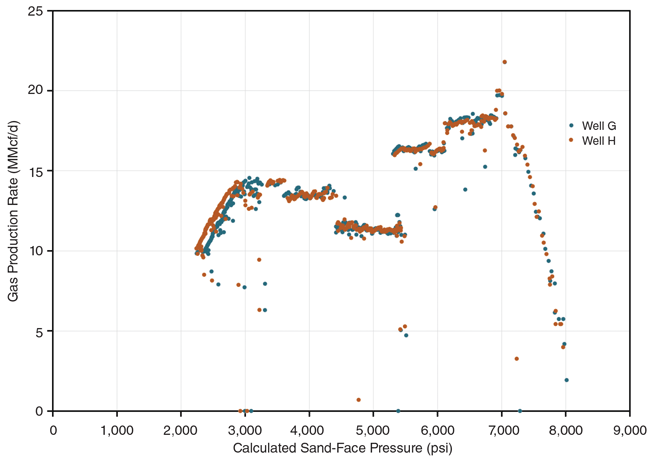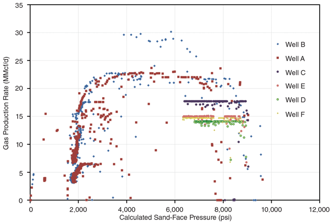 Looking at production versus calculated sand-face pressure, gas production from the two unmanaged drawdown wells clearly drops with sand-face pressure at a critical pressure much higher than line pressure. Interestingly, this behavior occurs almost at the same critical pressure in both wells. This behavior could be the result of the pressure dependency of matrix permeability or stimulated reservoir volume (SRV) permeability, but is most likely associated with the pressure dependency of hydraulic fracture conductivity.