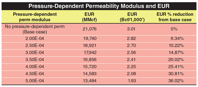 Because pressure-dependent modulus is unknown at this stage in the Utica’s development, a wide variety of g values obtained from Eagle Ford and Haynesville shales were applied for a range of sensitivities. The respective EUR and production forecasts associated with each design are listed in Table 2. As g increases, the EUR from the well can be reduced by 36 percent. This is obviously significant to well economics.