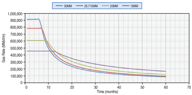 The final step was performing economic sensitivity analysis to understand the impact of various flowing rates on net present value and internal rate of return. This required understanding the impact of flowing at flat daily rates of 30 MMcf, 25 MMcf, 20 MMcf, and 15 MMcf, with 30 MMcf/d chosen as the maximum rate because of equipment and facility limitations (the wells under managed pressured drawdown are typically flowed back between 13 MMcf/d and 20 MMcf/d). The base-case type curve was developed based on all of the producing wells in the area using managed pressure drawdown.