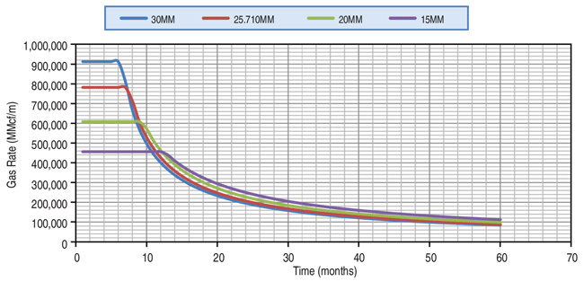 Producing the well at a flat rate of 30 MMcf/d for six months (again, assuming no damage to the reservoir) and yielding the same EUR as all of the other cases results in an NPV of $3.5 million and IRR of 36 percent. The next task was performing sensitivity analyses to find out the percentage uplift in the type curve needed to justify producing the wells at lower rates by obtaining the same after-tax IRR (36 percent) achieved at 30 MMcf/d for six months.