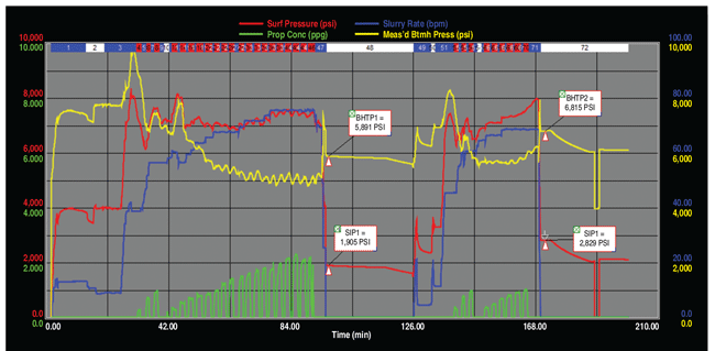 With the ECDP process, these three diversion processes are cycled through many times during a single frac stage. Figure 3 shows actual pump rates and the pressure response to ECDP treatment for stage seven, the last of the four stages in the open annulus section. All four stages had incremental increases of 300-900 psi in BHTP compared with ISIP.