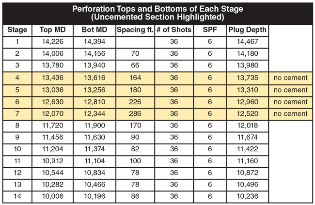 Table 1 shows the top and bottom perforations of each stage. Note that the varied spacing distance is related to the fact that stages pumped in the uncemented section of pipe were separated by a greater distance than stages in the cemented section. Stages four-seven were pumped in the uncemented annulus.