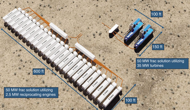 Regarding pad size, Carroll points out that turbines tend to have a smaller footprint than reciprocating engines. “Many of the recips we see generate 2.5 megawatts each, meaning a site needs a few of them to power a whole fleet,” he explains. “However, some operators prefer them because they know that if one goes down, pumping can continue.”