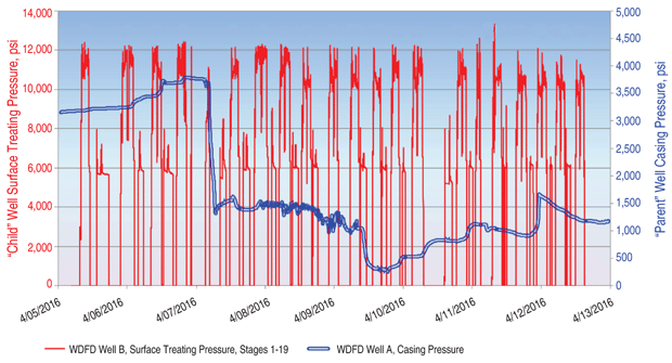 Figure 1 shows an increase in pressure in a Woodford Shale parent well (Well A) that was shut in while an adjacent offset child well (Well B) was being hydraulically fractured. The well was opened after the fourth stage of the child well’s completion.