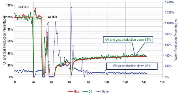 Figure 2 shows a parent well’s production trajectory before and after an adjacent child well’s completion. The depicted production curve incorporates a phase during which the parent well was temporarily shut in, followed by its reintegration into the production regime. In this case, the parent well was on gas lift. It required 28 days to restore its production levels to the pre-shut-in trajectory. On day 60, a coiled tubing clean-out run was performed to ensure no bridges had been created in the lateral during offset completion operations.