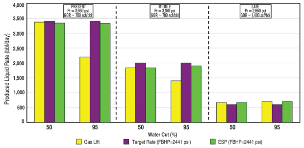 In terms of mitigating the effects of a frac hit in which fracturing fluid invades an adjacent well, the primary objective is to expediently extract the influx of water from the formation to resume hydrocarbon production. To this end, deploying an ESP is a strategic choice, given the higher fluid lifting capacities and ability to enhance recovery rates. Figure 3 shows the favorable performance of ESPs relative to gas lift systems across varying degrees of water saturation within the reservoir.