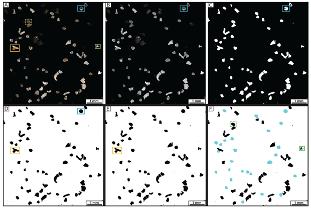 Figure 1 shows the image analysis protocol for proppant counts using an example portion of an image of the 250-500 µm size fraction. At top left (A) is the prepped sample image containing proppant, aluminum and some shale still visible. The image analysis protocol consisted of: