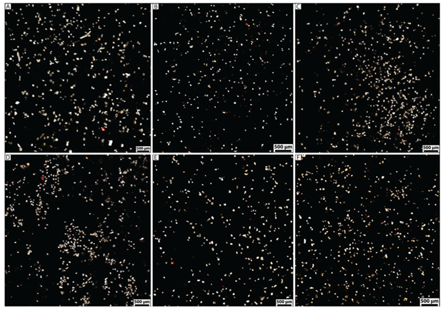 Figure 3 shows randomly chosen examples of retrieved 63-120 µm proppant across all six cores, demonstrating minimal grain crushing in both Upper (panels A-D) and Middle (E and F) Wolfcamp fracture face samples. Some grain crushing can be observed, but the majority of proppant recovered is rounded. Therefore, most of the recovered proppant is seemingly 100-mesh base sand, possibly because the pumped proppant contained a much larger size range than was indicated by the standard mesh size.
