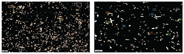 Another challenge related to the 100-mesh base sand, which contained pink and yellow-hued grains in addition to clear-to-white. Scanning electron microscopy X-ray energy dispersive spectroscopy (SEM-EDS) revealed that many of the 100-mesh base grains have Fe-oxide deposits on the surface, giving them a reddish or yellowish color. Figure 4 (left) shows examples of a random sampling of fresh 100-mesh base proppant imaged with a macro lens, highlighting the vast range in sizes pumped. The white boxes denote the oxidized grains with yellow-orange-reddish hues.