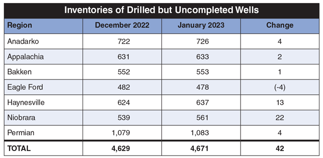 That was not the case one year ago, when the Eagle Ford’s 657 DUCs ranked third behind only the Anadarko Basin and mighty Permian Basin. One year later, only 478 DUCs remain across the Eagle Ford, which is not only the lowest DUC count in any play, but a full 75 DUCs behind the region with next lowest count in inventory, the Bakken Shale. As shown in Table 1, the Eagle Ford was the only shale region to experience a net decline in DUCs between December 2022 and January 2023.