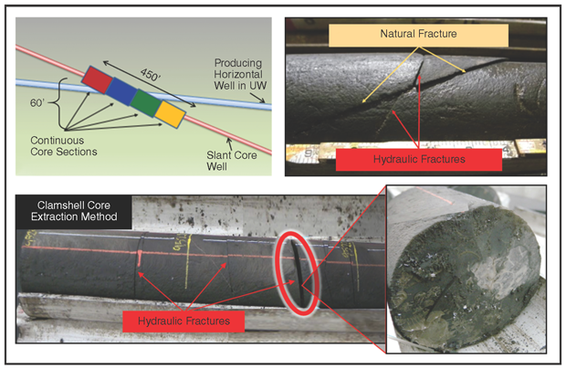 The recovered core captured hundreds of hydraulic and natural fractures, and in many cases, captured the interaction of a hydraulic fracture with a natural fracture. Comprehensive hydraulic and natural fracture characterization was performed. Figure 2 (upper right) shows a hydraulic fracture cutting across a natural fracture with a slight offset. Documented SCW hydraulic fracture frequency and complexity is considered to greatly exceed current industry technology with respect to hydraulic fracture modeling and simulation technology. Results from the SCW, subsurface proppant distribution, and insights from other acquired datasets are providing the basis for the research team to visualize and describe the physical parameters of the subsurface hydraulic fracturing process.
