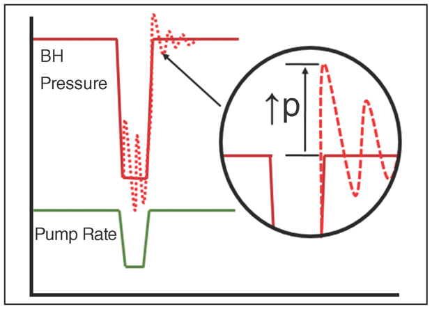 The rapid changes in the fluid flow rate temporarily produce a pressure pulse (p) of hundreds to thousands of psi (Figure 3). This pulse propagates in the wellbore from the surface to the perforations. If the created pulse pressure combined with bottom-hole pressure is higher than perforation breakdown pressure, previously unopened perforations will open and initiate new fractures. Real-time analysis of both the perforation efficiency as well as the downhole pressure response allowed for careful design and implementation of these rate fluctuations.