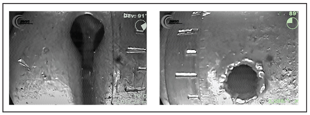 The camera was deployed on 2 1⁄8-inch coiled tubing with an electric line pumped inside to allow for downhole communication to the surface. This enables the camera to livestream video to anywhere in the world. The CT is needed to push the camera horizontally throughout the lateral leg of the well in a controlled manner to allow the camera to capture all the video of the perforations. The logging speed through the perforations was 10-12 feet/minute to allow the best view of the perforations, and then 60 feet/minute through the areas where there were no perforations. These were the optimal speeds to reduce time on location and gather the high-definition data required for a thorough analysis.
