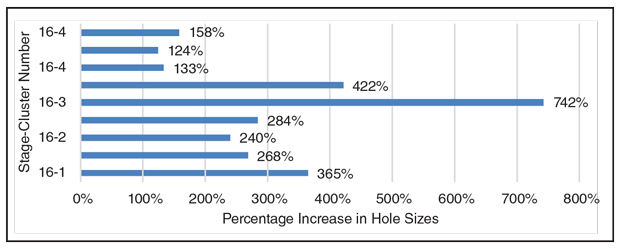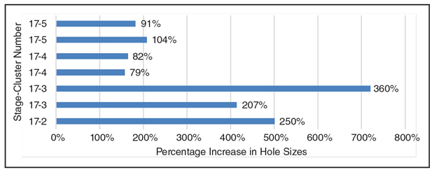 Stage 16 had diverter pods dropped with most of the fracture treatment going evenly into the clusters and a higher percentage of growth in the radius of the perforations. This stage had average growth of 304% and a high of 742% growth in perforation size compared with the initial pre-fracture perforation. Stage 17 (Figure 3B) had no pods and the fracture treatment stayed mainly in the heel section of the cluster, with average growth of 175% and a high of 360% in perforation size. It is easy to see that the diverters helped equalize the growth of the perforations during the fracture treatment process, even though both fracture treatments showed preferential growth toward the heel.