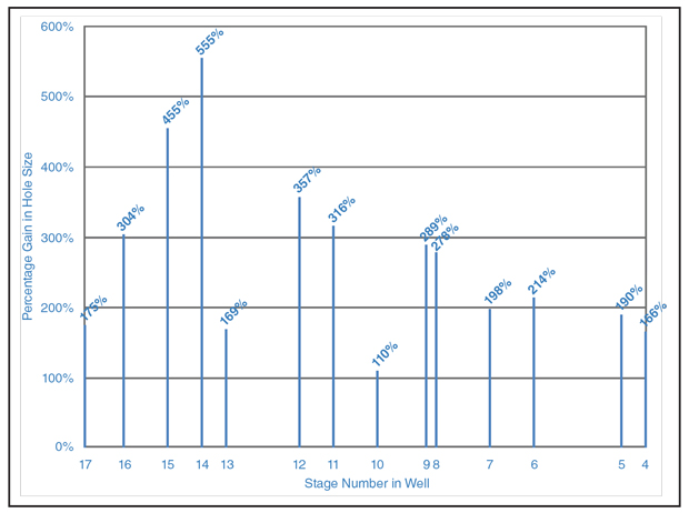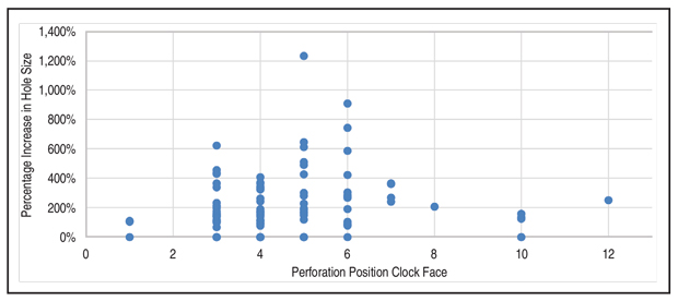 Other variables include perforation orientation within the casing. Using “clock face numbering” from 1-12, with high side representing 12 o’clock and low side 6 o’clock, shows perforation effectiveness (Figure 4). Of course, other variables occur within the wellbore, such as continuous cement bond, deviation and the perforation shot density, but for this wellbore, the data was consistent. The perforations on the low side from 3-7 o’clock showed the largest growth in diameter post-fracture treatment.