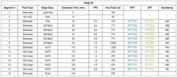 A total of 12 unique water-phase tracers and oil-phase tracers were injected into the heel-most stage (stage 48) to tag individual fluid and sand segments beginning with the pad segment and ending with the 2.0 lbm/gal, 40/70-mesh stage. All fluid and sand segments were allocated unique tracers. The tracers were continuously injected along with the frac fluid at a constant concentration throughout each individual segment. The chemical tracers were “conservative” tracers, exclusively soluble in their carrier fluid and resistant to decomposing or reacting under subsurface conditions. The detailed tracer injection layout and pump schedule is shown in Table 1.