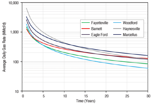The Haynesville has the highest well EUR, followed by the Marcellus, Eagle Ford, Barnett, Fayetteville and Woodford. The Haynesville also has the steepest production decline, but the Eagle Ford has a fairly steep decline as well (Figure 2). The Barnett and Marcellus have the most gradual decline production trends.
