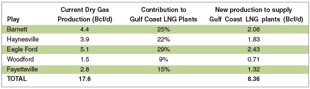 The impact of Gulf Coast LNG exports on regional shale plays was analyzed based on a weighted average to get the contribution percentage of the 8.36 Bcf/d of gas production needed to maintain full LNG export capacity of all Gulf Coast trains. Table 1 shows each play’s contribution.