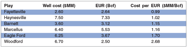 To predict future drilling hot spots, the study looked at the ratio of EUR versus well cost for the plays, admittedly ignoring other factors that may influence drilling decisions. The Fayetteville yields the greatest EURs for the lowest well cost, followed by the Haynesville, Barnett, Eagle Ford and Woodford (Table 2).