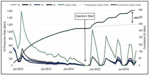While only one injection cycle was conducted in the Bakken pilot, this process is best applied in a round-robin fashion on a pad of four-six wells, with each well experiencing multiple injection cycles. This approach allows for effective repressurization of the overall pad and substantial voidage replacement (Figure 4). Given the positive response in oil production seen in offset wells in the pilot, it is suggested that the well injection sequence can be optimized much like a frac treatment sequence to achieve the best result.