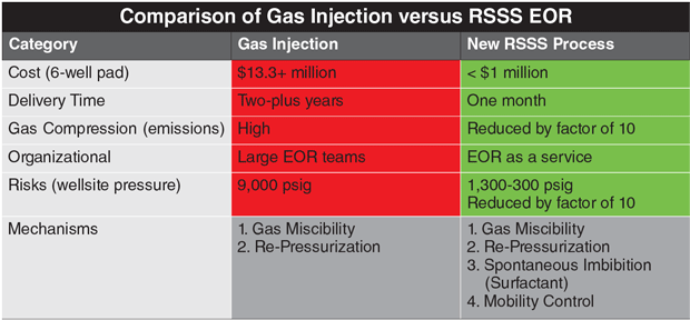 As shown in Table 1, the RSSS process compares favorably in head-to-head comparisons with single-phase gas injection for huff-and-puff EOR. For an equivalent application, the RSSS process has a much lower cost and provides faster delivery versus the large-horsepower compressors used in conventional gas injection projects. Importantly, gas compression and emissions are reduced by a factor of 10, and operational risks also are mitigated by dropping surface injection pressure from 6,000-9,000 psig to under 1,300 psig, which is within the range of normal gas lift injection pressures.