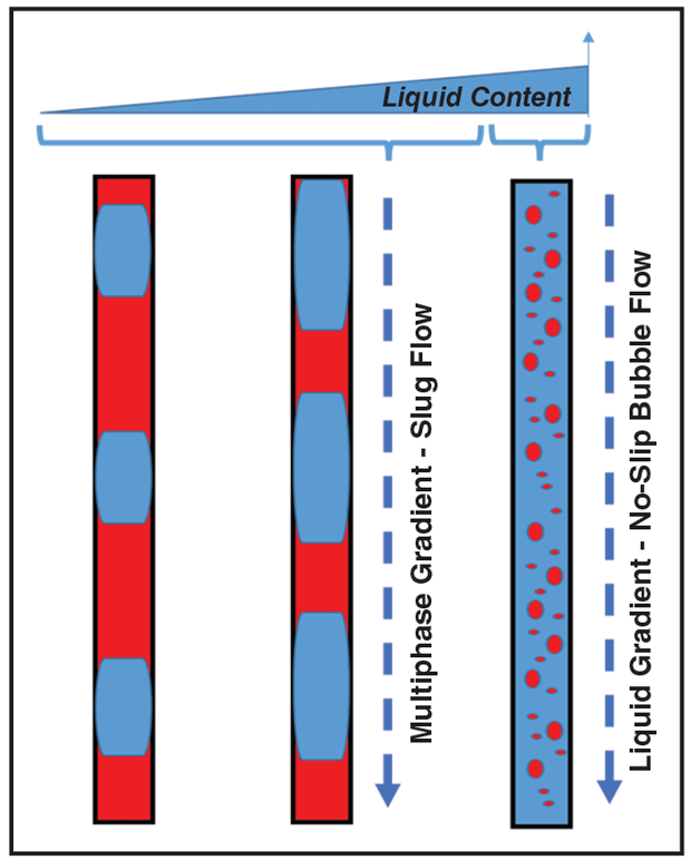As shown in Figure 2, the vertical wellbore will have several liquid slugs and gas bubbles present at any given time; typically more than 20 slugs. The RSSS process varies the slug and bubble lengths at the surface to deliver a predetermined bottom-hole pressure and keep the slug flow structure stable. This multiphase gradient lies between a pure liquid and pure gas gradient, allowing injection using normal gas lift systems or small gas lift compressors that are readily available.