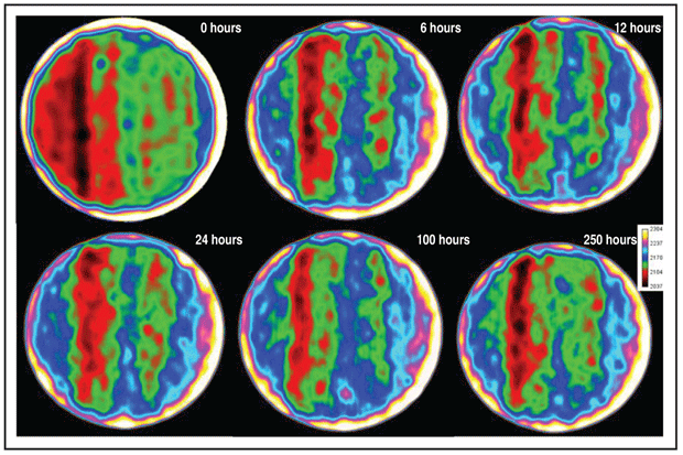 As noted, the RSSS process also results in SASI because it alters wettability with the proper choice of surfactant. The impact of wettability alteration with surfactant is well established by laboratory work, field tests and technical papers. Interestingly, the surfactant penetrates deep into cores to alter wettability and is not just a fracture surface mechanism, as illustrated in the computerized tomography scan of Wolfcamp core samples shown in Figure 3. The color changes to blue and green from the initial red color, indicating that a denser phase (surfactant solution) was displacing the less dense phase (oil). There also is supporting indication of this mechanism from field tests using surfactant in frac water, where surfactants accelerated and improved recovery over a 36-month field trial.