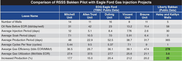 The first RSSS pilot was executed in the Bakken formation (Table 2). The single injection cycle reached a bottom-hole pressure of 4,600 psig, which was significantly greater than the approximately 2,450 psig MMP and represented a first for an EOR process in the Bakken. More than 46 MMcf of rich gas was co-injected along with 40,000 barrels of freshwater with surfactant at two gallons per 1,000 gallons of water.
