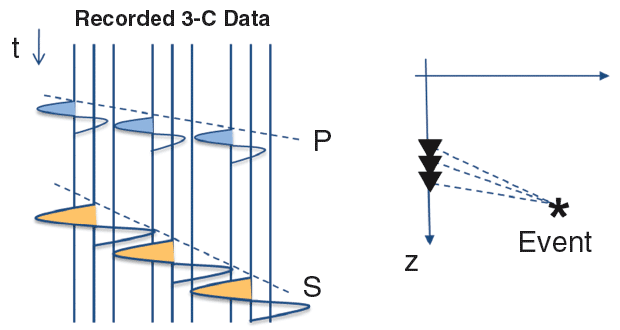 If the difference between the arrival times of each wave type is known, and the velocity of the waves in the earth is known, the distance from the geophone to the fracture location can be determined. Figure 1 shows 3-C recordings for a microseismic event illustrating the P- and S-wave arrivals (left), and a representation of an event next to the downhole array with the seismic wave paths (right). The slope of the arrivals across the array is an indication of the wave’s velocity.