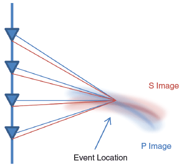 The full-waveform migration approach uses the power of the stack to overcome the noise and stabilize travel time estimates. In the case of downhole, full-wave imaging, the location estimate is driven by the independent, co-location of both the P- and S-wave fields. Figure 2 shows a representation for the downhole recording of a full waveform-migrated P- and S-wave imaged event. The event location is where the energy of the migrated images intersects.