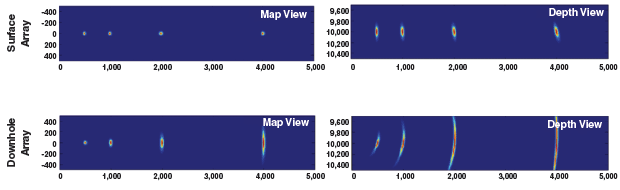 The map and depth views in Figure 3 illustrate how event location uncertainty increases with distance for both surface (top) and downhole (bottom) arrays. A good rule of thumb is that events located farther away than three times the length of the array are most likely poor.