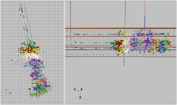 The point set extends approximately 3,000 feet from the monitoring borehole. Events from beyond this threshold possess unacceptable uncertainty and are not passed through the imaging and event editing workflow. In Figure 5, the surface-acquired imaging point set is slightly less rich, but the imaging extends underneath the entire footprint of the surface array with acceptable uncertainty throughout (the point set extends across the entire well because of the larger surface-array footprint).