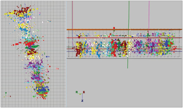 A downhole imaging case study from the Permian Basin illustrates the improved imaging capability. Figure 4 displays the rich downhole imaged point set surrounding the monitoring borehole, showing good zonal control and excellent event count. Since the imaging utilizes both P- and S-wave energy, but does not depend on separating P- and S-wave arrivals in time (as does P&S picking), the imaging point set contains valid events close to the monitoring borehole.
