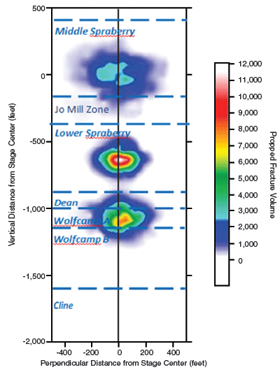 In this Permian Basin example, propped fracture half-lengths and heights were determined for three wells completed in the Middle Spraberry, Lower Spraberry, and Wolfcamp A intervals. The wells were vertically stacked above one another, indicating the potential to optimize wellbore spacing (Figure 6). The microseismic data showed an undeveloped gap between the Middle and Lower Spraberry, indicating that the vertical wellbore spacing between the two likely was excessive with the completion methods used. This left the potential for placing a wellbore in the Jo Mill formation for ideal exploitation of the reservoir.