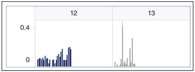 Figure 1 shows the results for two adjacent stages (stages 12 and 13). The vertical axis represents the eroded area of the perforation. The initial perforation size was 0.42 inch, which is the “0” point on the vertical axis. The “0.4” point on the vertical axis represents an eroded area of 0.4 square inch above the baseline of 0.42 inch. Stage 12 is a microproppant stage and each vertical blue line represents one perforation. This stage was a 10-cluster design with three perforations for each cluster, for a total of 30 perforations. If one counts the blue lines, 28 of the 30 perforations (or 98%) received proppant. On stage 13, which was also perforated with 30 perforations, 17 of the 30 perforations (57%) received proppant. Stage 13 also shows that perforation No. 7 was a “runaway” perforation that took a large portion of the total treatment.