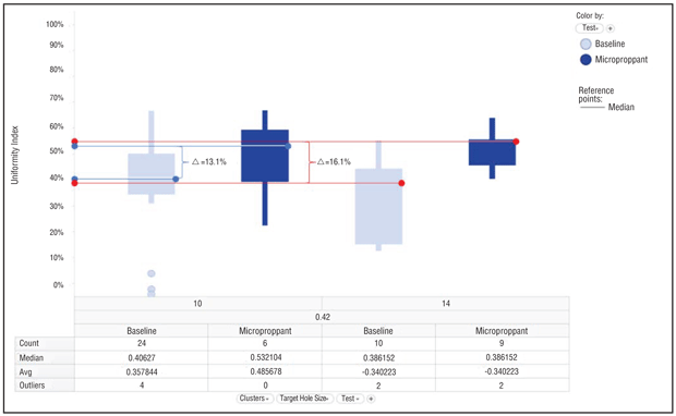 Figure 2 shows a statical analysis composite of all the stages. The light blue boxes represent the nonmicroproppant baseline stages while the dark blue boxes represent the microproppant stages. The white line running through the boxes is the median value for all of the tests. The results indicate that the median value for the number of perforations that received proppant increased by 13.1% in the 10-cluster well and 16.1% in the 14-cluster well. In general, the completion efficiency of the stages treated with the ceramic microproppant was increased by 15% to an overall competition effectiveness of 54%.