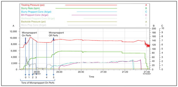 The expected impingement velocity of proppant entering the fracture is in the range of 50-90 mph. Using the 10-cluster case and the pump rate shown in Figure 3 (10 clusters, three perforations/cluster, 48% efficiency, 60 bpm = 4 bpm/perf = 7,000 feet/second), the particle velocity as it exits the perforation is about 80 mph. The ability of proppant to increase perforation hole size by eroding steel is well known. In the case of microproppant, it is believed that the microproppant probably does not affect the perforation geometry, but because it abrades the near-wellbore rock, it improves the distribution of the following frac treatment. In this case, the 100-mesh in the following stages abraded the perforation.