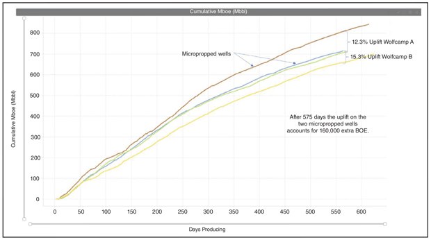 There are several examples of the dramatic production improvement provided by using a microproppant. Figure 4 is from a recent test in the Delaware Basin’s Wolfcamp formation in West Texas. At an oil price of only $50 a barrel, the extra value provided by the microproppant is $8 million.