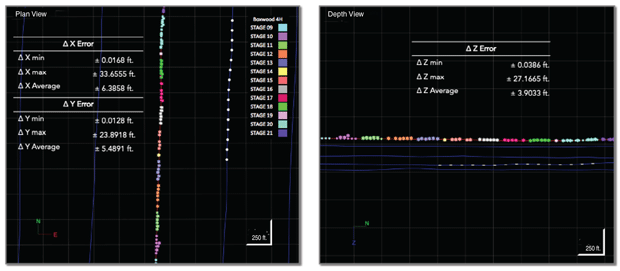 To quality control the velocity model, perforation shots were relocated to compare the model-predicted relocations using the final velocity model with known perforation locations. As shown in Figure 2, those errors can be used to quantify the upper bounds of location error for the microseismic events.