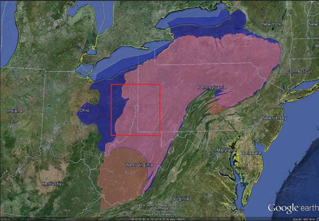 The extent of the Utica Shale is shown in blue; the Marcellus Shale is indicated by pink; and a red box outlines the general study area.