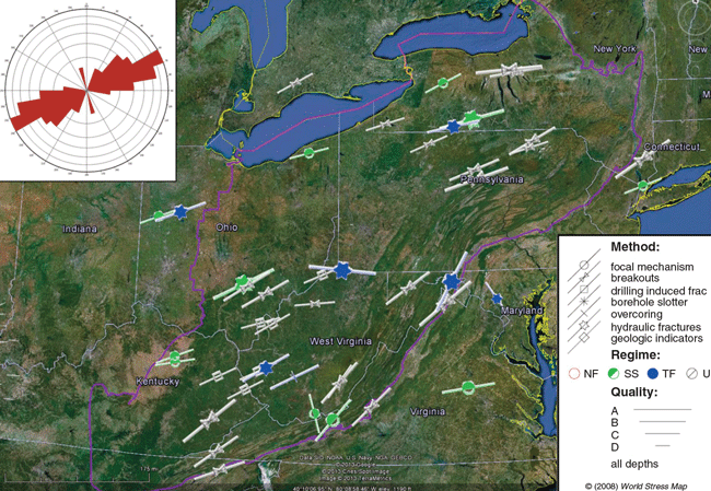 The world stress map shown in Figure 3 indicates the maximum horizontal stress in the Appalachian Basin is northeast to southwest. This orientation is based on regional teleseismic focal mechanisms, borehole breakouts, geologic indicators, and hydraulic fracturing in several regimes, such as strike-slip. Most of these data points are high quality and accurate to within 25 degrees.