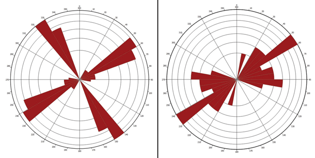 The secondary Utica Shale orientation is not as common in the Marcellus Shale. This may indicate that the maximum horizontal stress at the time of natural fracture formation in the Utica Shale was approximately east to west.