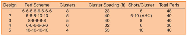 The downhole camera was used to inspect perforations for visible signs of erosion associated with slurry exiting the perforation. A semiquantitative ranking scheme was established to characterize the amount of erosion and place each perforation in one of three categories: major erosion, minor erosion or no erosion. Five perforating schemes were tested–four geometric shot cluster (GSC) schemes (where an equal number of perforations was used in each cluster) and one VSC scheme–with variations in the number of clusters, cluster spacing, perforations per cluster and perforations per stage (Table 1). All stages used 0.43-inch entry-hole diameter perforations, 200-foot stage lengths, and 15% 100-mesh and 85% 40/70-mesh proppant.