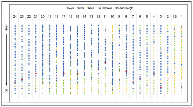 The semiquantitative ranking was repeated, and the toe clusters in all observed stages (four total) contained major erosion perforations. In addition, the 90% sand length was calculated as before and increased from an average of 125 feet in the previous evaluation to 160 feet (i.e., the entire stage). No issues were experienced in regard to being rate-limited with 34 perforations.