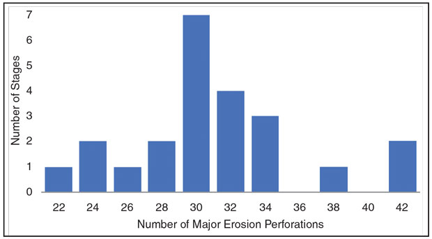 However, one factor controlling proppant distribution that stands out is EFA, or the combined area of all perforations. Figure 3 shows a relatively normal distribution with respect to the number of major erosion perforations seen in each stage. We suspect that this is not a product of the number of perforations, but simply a function of the EFA. Other factors may impact this result as well, such as formation properties, casing string diameter (5.5-inch in this example), treating rate, and more. But the near-normal distribution inspires confidence that, for this specific set of parameters, we can treat 30 perforations effectively. We have not attempted to repeat this evaluation for a different set of conditions, but have no reason to suspect that a similar approach cannot be repeated elsewhere (albeit, with a potentially different resulting EFA).