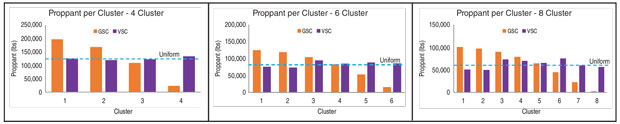 Based on this conceptual model, the impact of using a VSC perforating scheme as opposed to a GSC perforating scheme for four-, six-, and eight-cluster stages with 500,000 pounds of proppant is shown in Figure 4. Heel-ward bias is prevalent in the modeled GSC perforating schemes, and the toe cluster(s) are understimulated. As modeled, the VSC perforating scheme mitigates heel-ward bias and promotes effective treatment of the toe cluster(s). Even with VSC, the results are not perfectly uniform, but proppant distribution is still much more uniform with the use of VSC than simulated in the GSC designs.