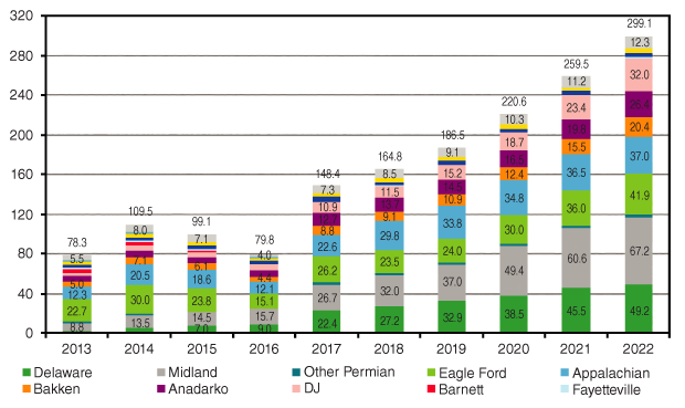 Looking forward, Jacob says Permian demand is expected to maintain its upward climb, reaching 119 billion pounds by 2022 to account for 40 percent of the total projected amount for all U.S. shale plays. At that forecasted level of consumption, Permian operators would be pumping proppant at a daily rate of 326 million pounds (163,000 tons, or enough to fill 1,500 railcars/10 unit trains).